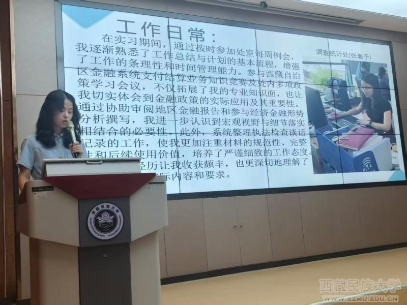 分享会上,来自不同实习单位的8位代表向新生分享了在西藏税务局、西藏人民银行等单位暑假实习的体会和收获。大家表示此次实习不仅极大地提升了工作能力和政治思想水平,还耳闻目睹了西藏和平解放以来的美好气象,深刻体会到没有共产党就没有幸福的新西藏。实习期间,同学们不但参与了实习单位的具体工作,掌握了业务部门的基本工作技能,而且还广泛开展了社会调研,公益活动等,切实达到了“绿色、团结、高效”的实习目标。同学们的实习成绩也得到了实习单位的广泛认可,许多实习单位还举办了隆重而热烈的送别仪式,部分同学获得了实习单位颁发的优秀实习生荣誉,为学校和学院增光添彩。