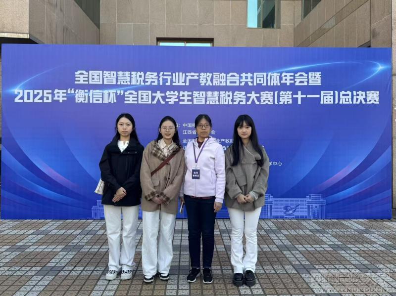 2025年11月29日,2025年“衡信杯”全国大学生智慧税务大赛总决赛在江西财经大学举行,财经学院税务专业三名研究生以扎实的专业知识和学以致用的能力荣获三等奖,陈爱东,徐敏娜老师获得优秀指导教师称号。