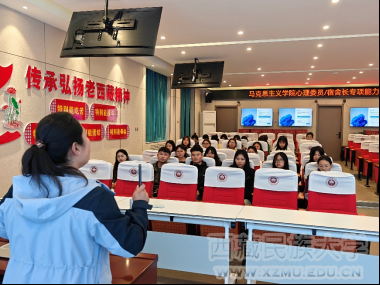 为深入贯彻落实教育部《关于全面推进健康学校建设的指导意见》,扎实推进大学生心理健康教育工作,按照学校大学生心理健康教育中心“心理委员、宿舍长等学生干部专项能力提升”培训工作安排,马克思主义学院于4月8日晚特邀学校讲师团成员、法学院益西卓玛老师开展专题培训。全院心理委员、宿舍长及各班班委代表参加本次培训,活动由院团学办何妮老师主持。
