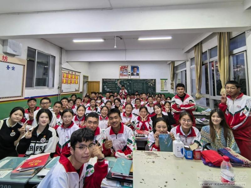 提问互动环节,高一(8)班同学积极举手提问,实践团成员耐心解答。针对同学们提出的“如何背单词”“如何对英语听力作出针对性训练”等英语专业问题,实践团成员利用自己的专业所学“对症下药”,尽力为同学们提供简单新颖的学习方式;面对同学们对大学的好奇与向往,实践团以西藏民族大学为例向大家介绍了校园内的锅庄舞大赛、歌手大赛、篮球比赛等,将大家对大学的向往有效转化为学习动力。最后,实践团成员为大家分发笔记本留作纪念并合影留念。