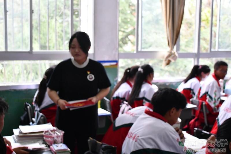 7月16日晚,实践团成员来到自治区拉萨中学高一(8)班展开宣讲。宣讲开始前,实践团成员为同学们分发了自制宣传册,册子中包含宣讲主体内容与西藏民族大学外语学院本学期实践活动精彩瞬间。