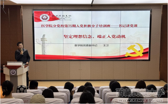 王卫以《坚定理想信念,端正入党动机》为题,为全体学员讲授专题党课。他结合医学院学科发展、医学生职业规划和毕业生案例,从医学生理想信念内涵、理想信念树立、理想信念挑战,如何强化理想信念等方面,深入浅出地讲解了理想信念对于医学生的重要性,引导学员筑牢信仰之基,树立远大的医学理想,将个人的职业追求与国家医疗卫生事业发展紧密相连。在端正入党动机方面,他从理论与实践多个层面展开,让学员们深刻认识到入党不是追求荣誉,而是意味着更重的责任与奉献。在践行责任担当方面,他强调作为民族高校的医学生,要主动服务西藏医疗卫生事业,积极参与社会实践,践行初心使命,守护各族人民身心健康。